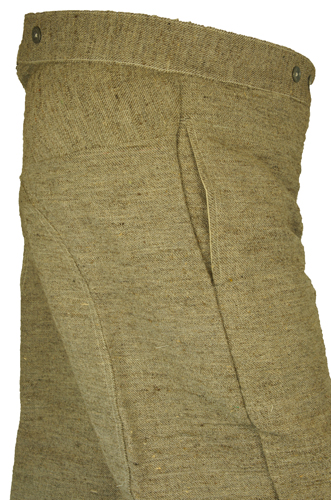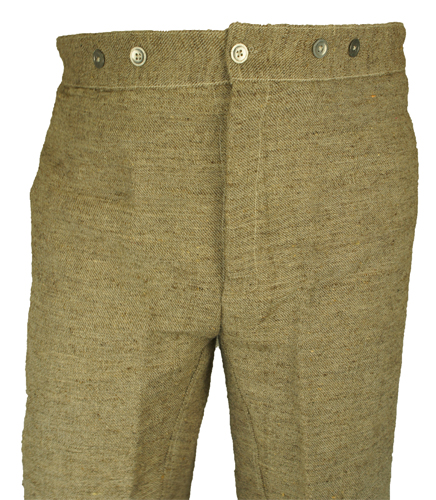 The trousers are equipped with an adjustable “V” back waistband with tie holes for personalized comfort, along with pewter fly and suspender buttons that maintain a period-correct appearance. Side seam pockets and a watch pocket offer practical use, while the unhemmed inseam allows for a custom leg length.